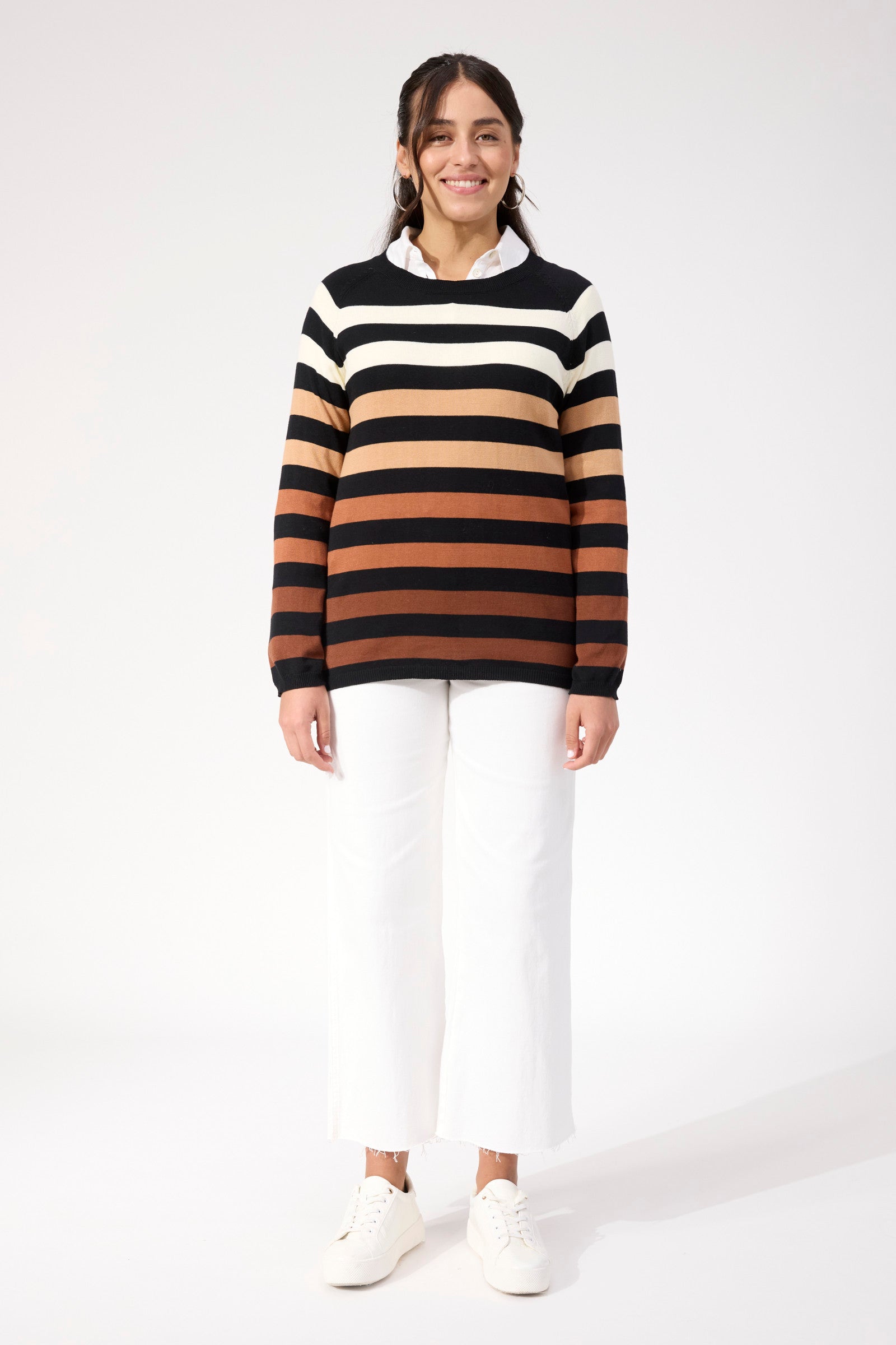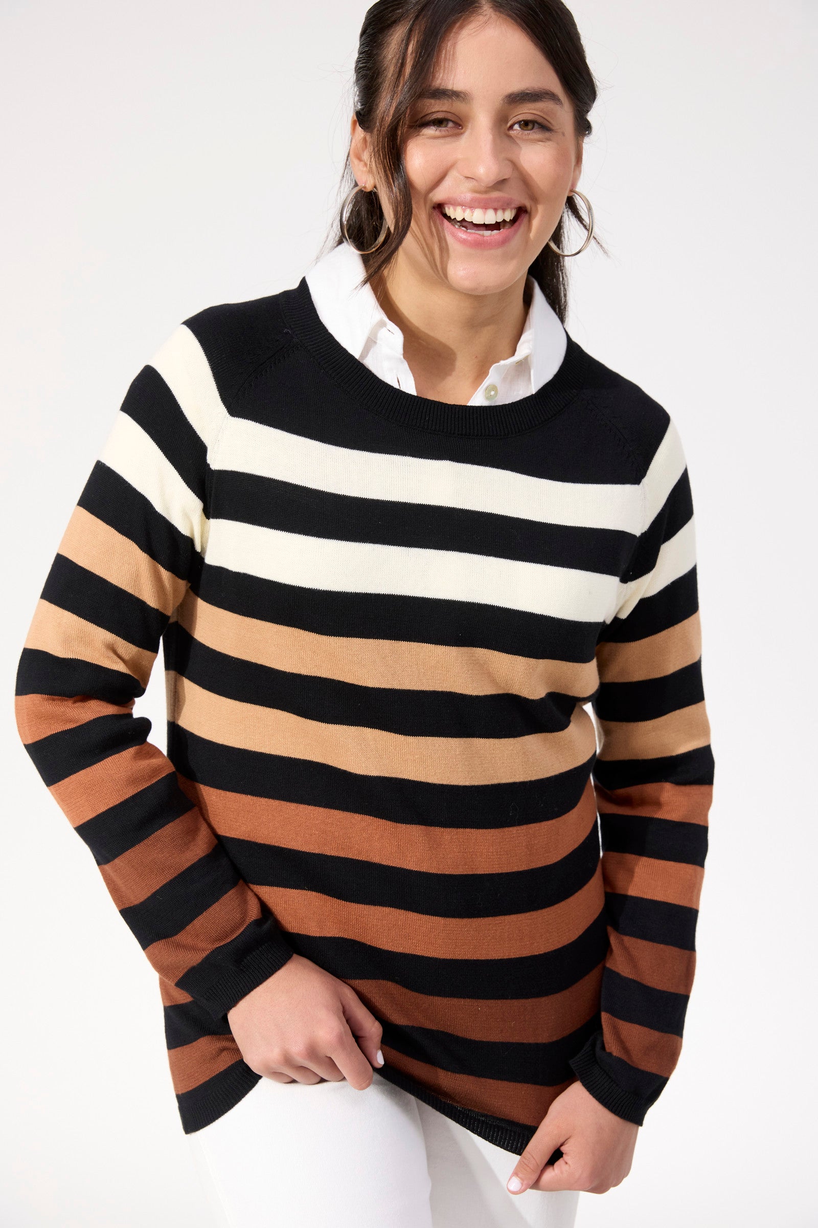 The Vermont Stripe Jumper brings effortless style to your everyday wardrobe. Crafted from mid-weight cotton knit, this piece offers the perfect balance of comfort and durability for year-round wear. The classic round crew neckline pairs beautifully with raglan long sleeves for a relaxed, flattering silhouette. Distinctive custom stripes add visual interest and versatility, making it easy to dress up or down