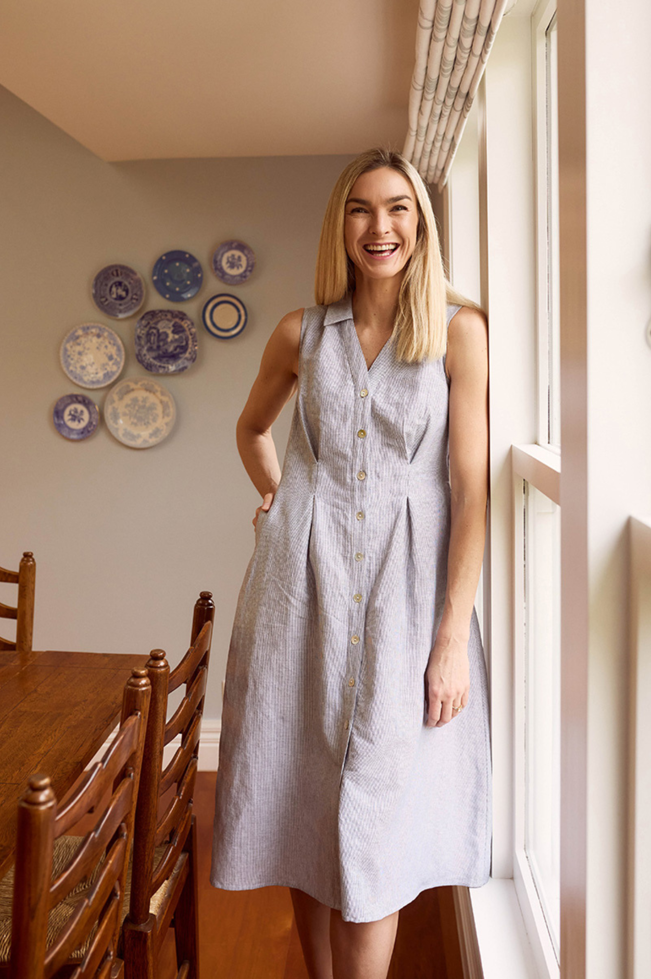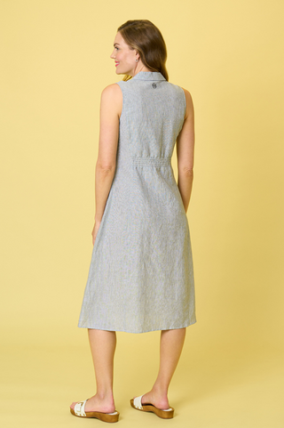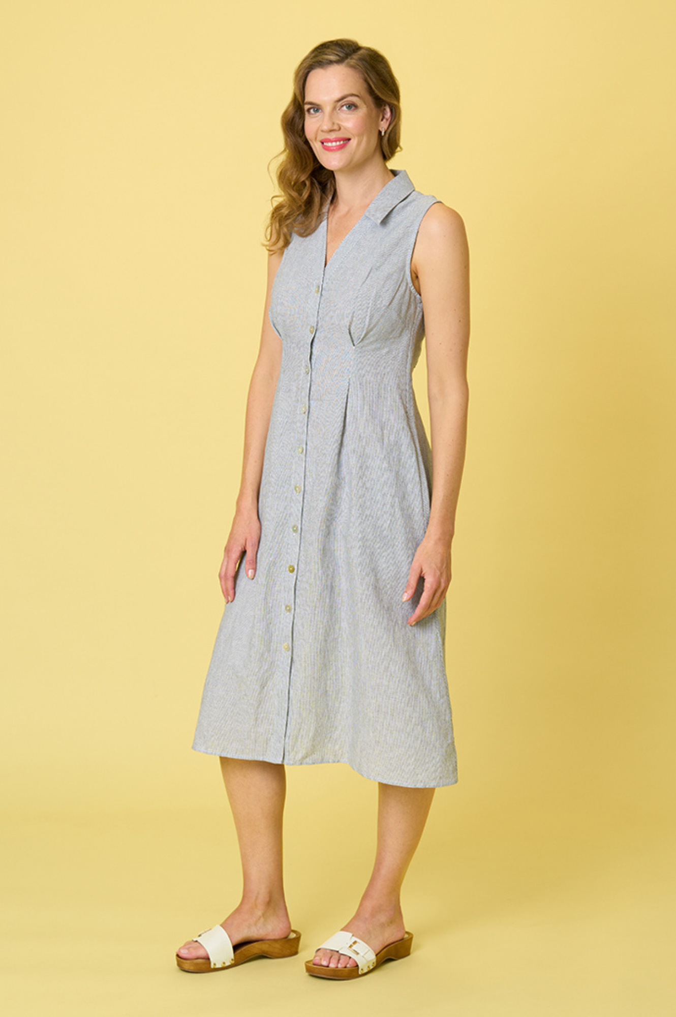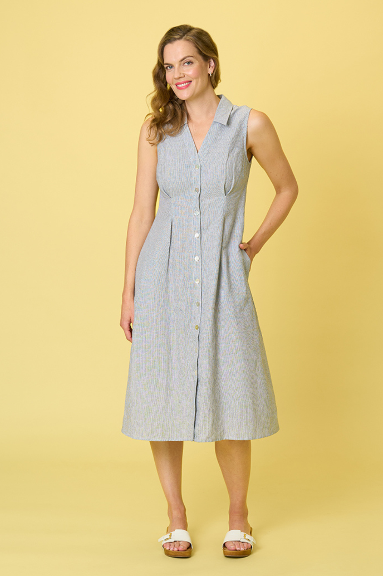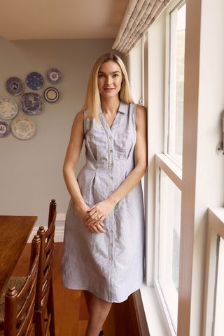 This sleeveless Viaduct Dress in navy stripe combines breathable linen and soft cotton for all-day comfort. Featuring a button-through front and a flattering vee neck with a small collar, it offers effortless style. Fitted darts at the front enhance your silhouette, making it perfect for both casual outings and smart occasions. Embrace timeless elegance with this versatile dress