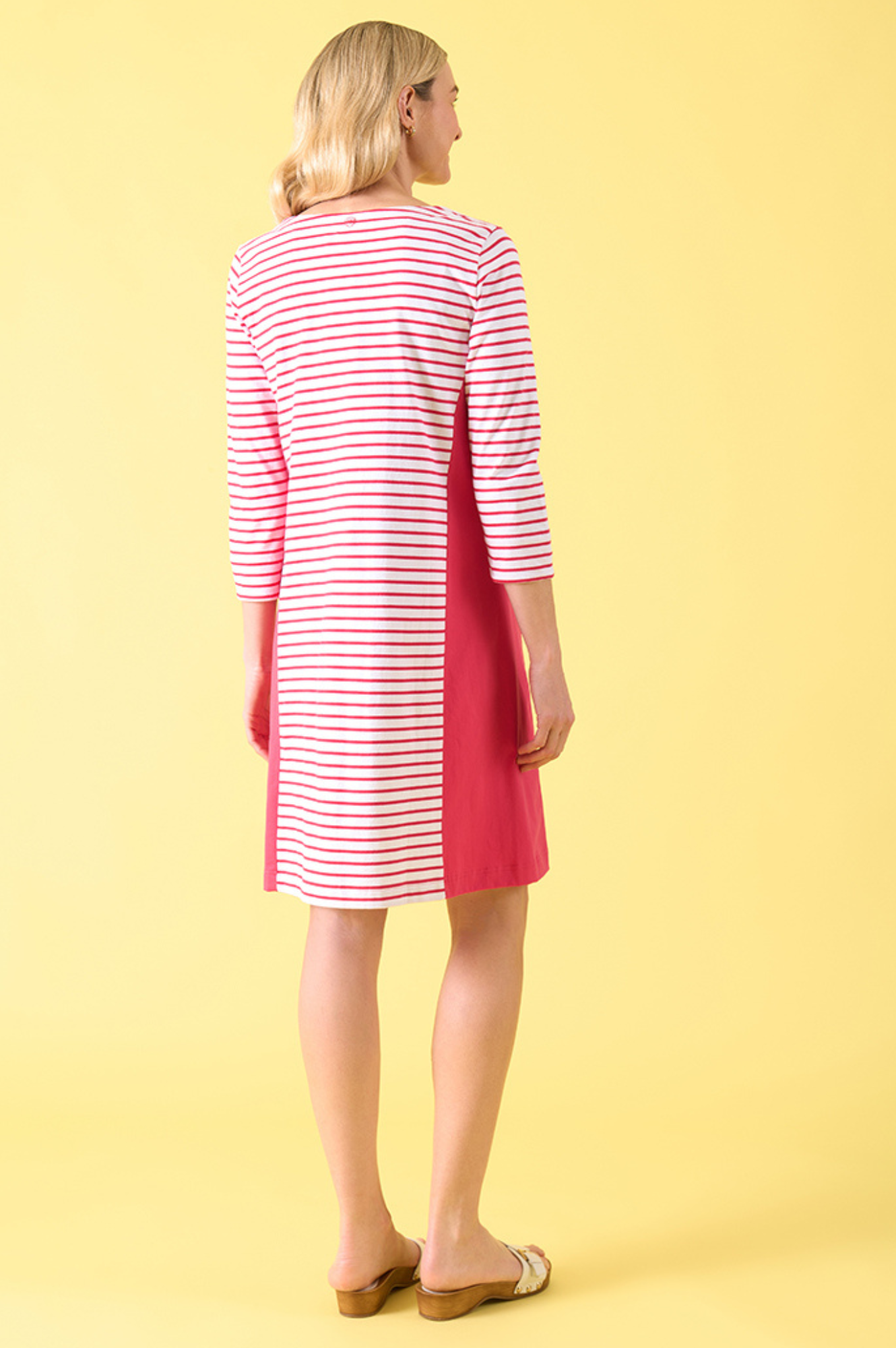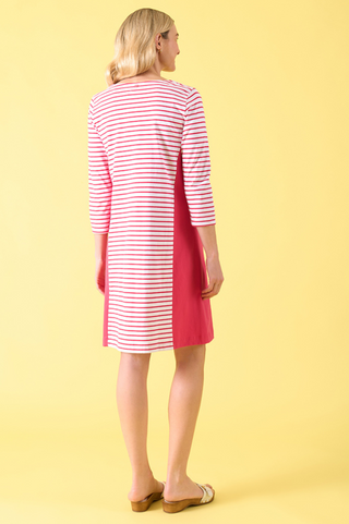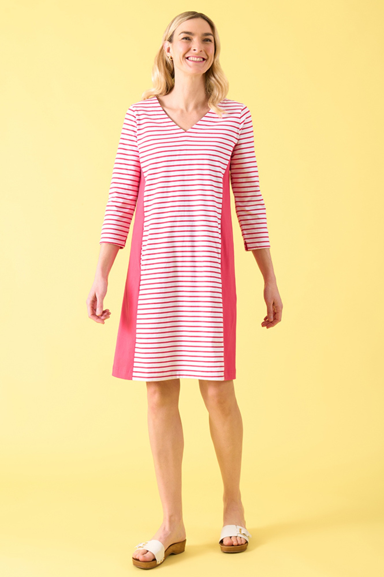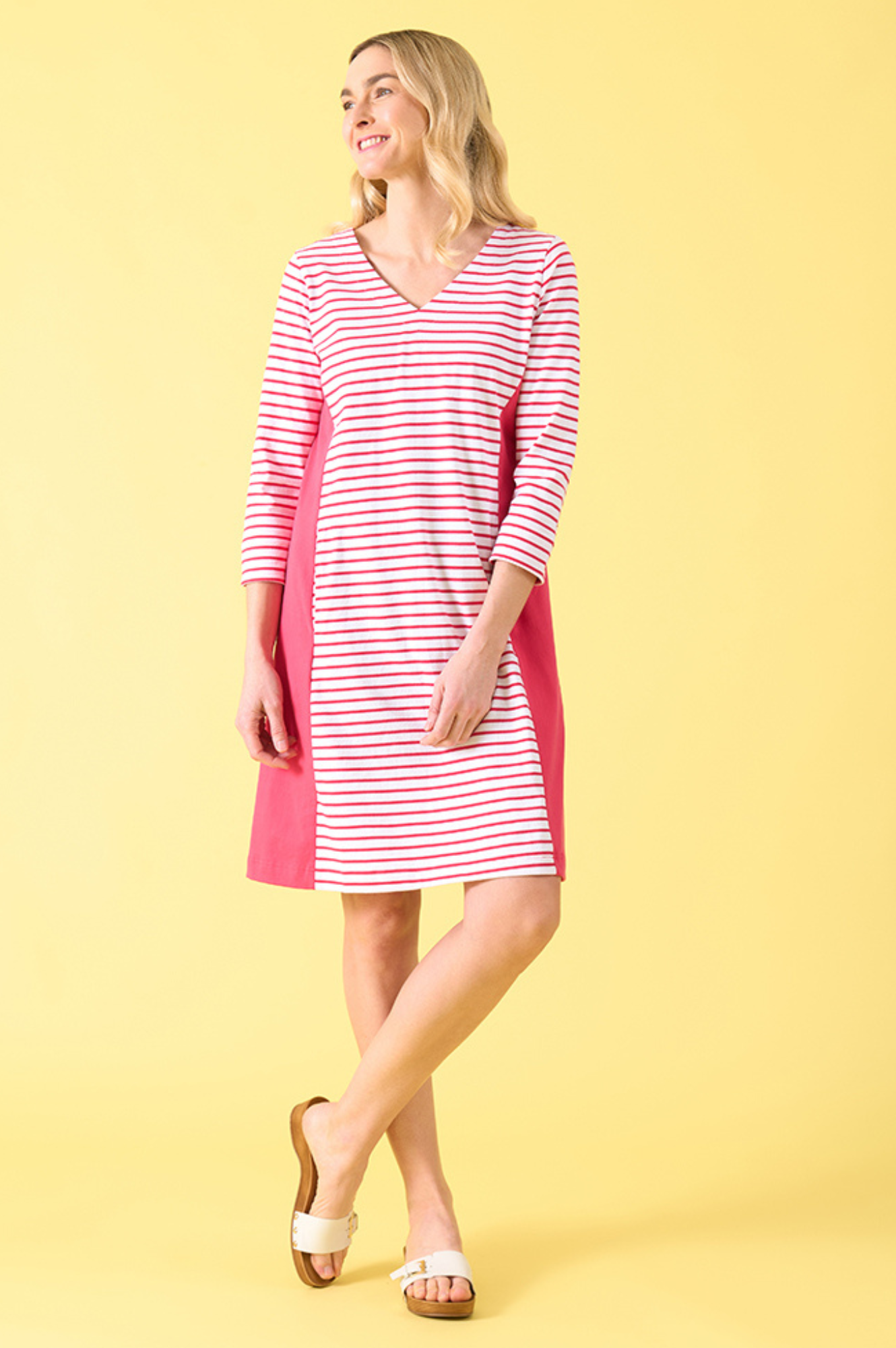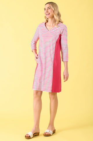 This Wainui Dress in Raspberry/White Stripe features a flattering V-neck and knee-length cut that enhances your silhouette. Its 7/8 sleeves offer a stylish balance between coverage and comfort, while the striped body paired with plain side panels creates a slimming effect. Perfect for both casual and dressy occasions, this dress combines comfort and elegance effortlessly